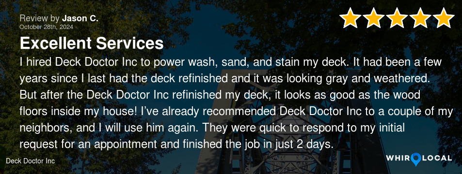 Deck Doctor Inc did a great job on our extensive deck project. The guys arrived early & left late! They had great attention to detail, & cleaned uo the work site at the end of each day. We will hire them again!
