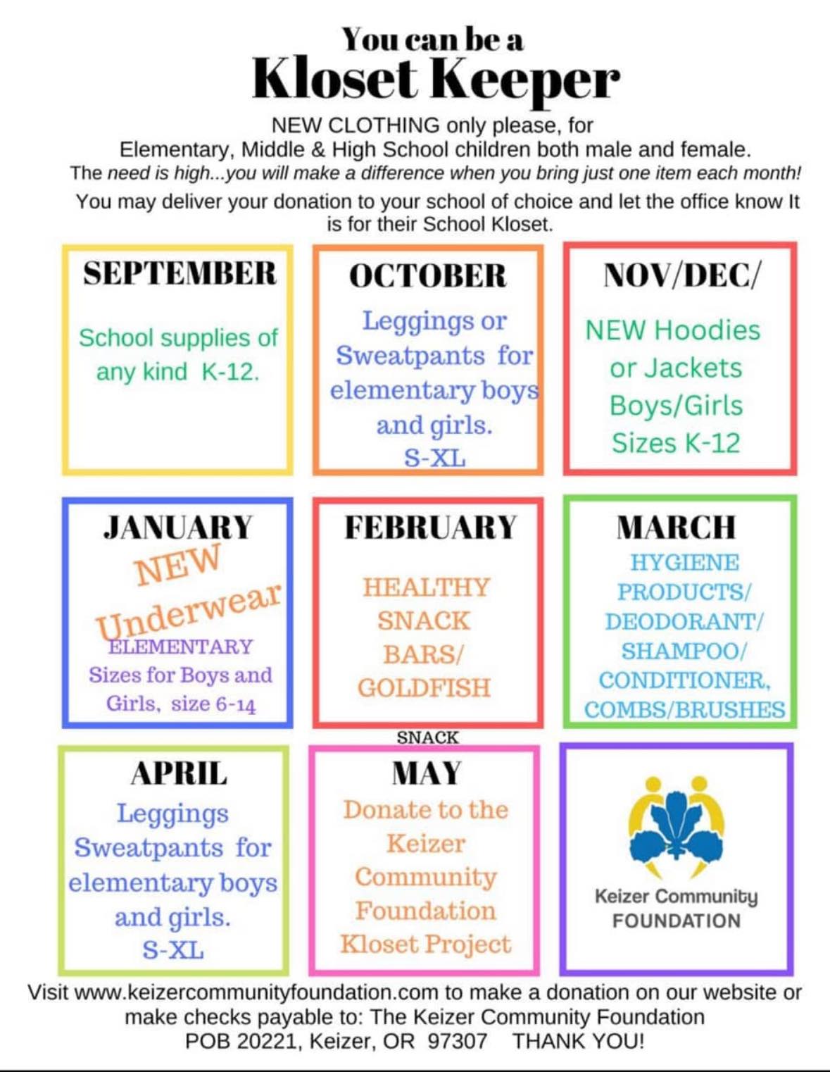 For more information about the The Keizer Community Foundation Kloset Program or how to donate, please contact Audrey Butler: [email protected] or visit our