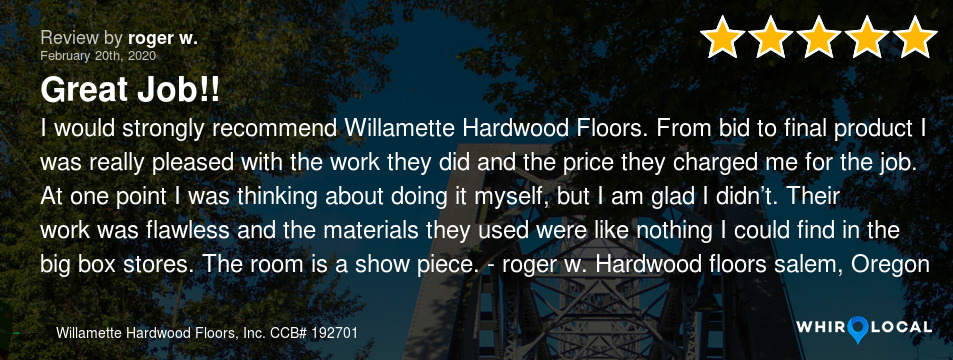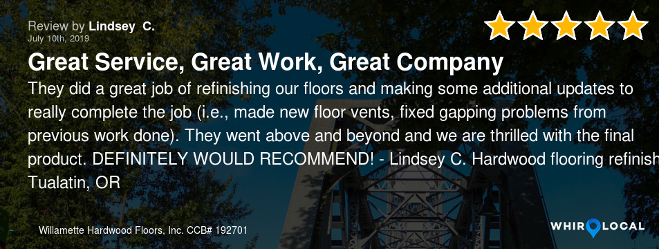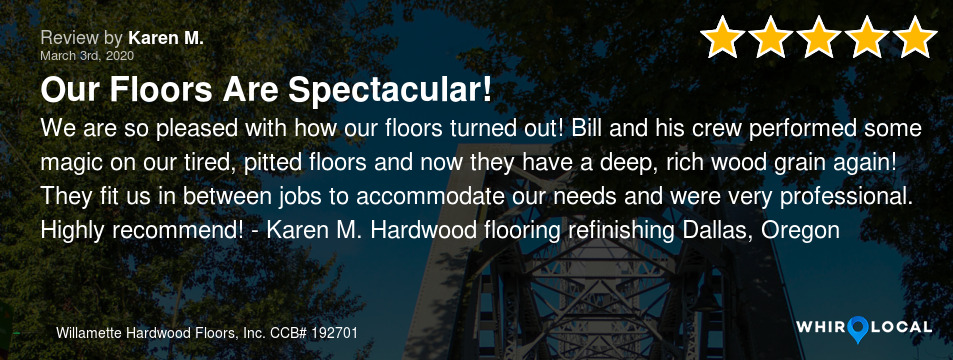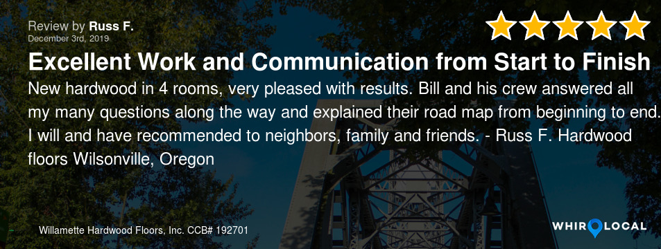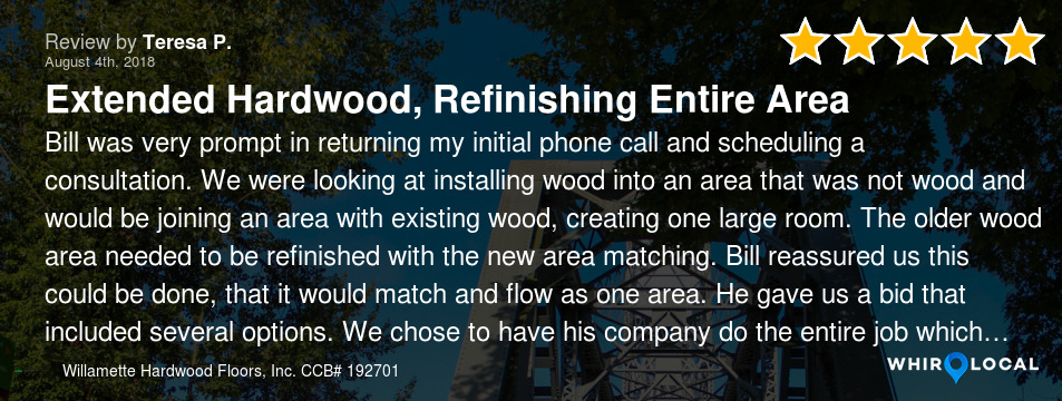 We love our hardwood floors. The house already had some in the entry and kitchen area and we had Willamette Hardwoods pull the carpet in our dining room, hallway and bedroom, match the old hardwoods and install it in those areas. The match is perfect and …Keep Readingwe are so happy to have more hardwoods and less carpet. I hope to use WH's again in a few years when we pull more carpet out!
