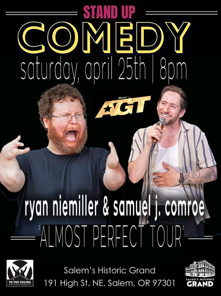 A big night of stand-up is headed to Salem as Samuel Comroe and Ryan Niemiller bring the Almost Perfect Comedy Tour to Salem’s Historic Grand Theatre and Event Center. Comroe, known for his appearances on America’s Got Talent, Conan, and more, joins Niemiller, the fan-favorite comedian from America’s Got Talent Season 14, for an evening of sharp, high-energy comedy.