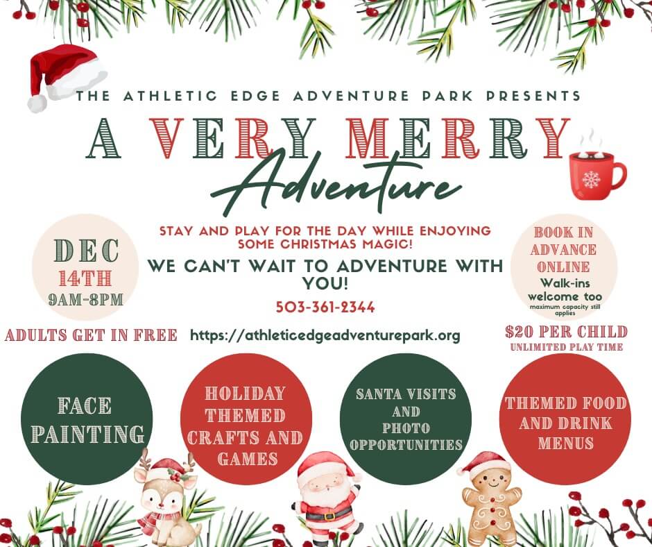 For the kiddos—celebrate the season with a full day of festive fun at Athletic Edge Adventure Park! Tickets include photos with Santa, crafts, games, face painting, holiday snacks and drinks, and all-day indoor play. Once you’re in, you can stay all day.