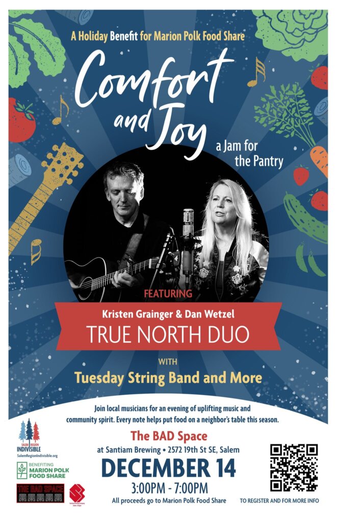 Enjoy an evening of live music for a great cause at Comfort and Joy. Featuring Kristen Grainger & True North alongside Tuesday String Band, this benefit concert raises funds for Marion Polk Food Share. 100% of proceeds support local hunger relief.