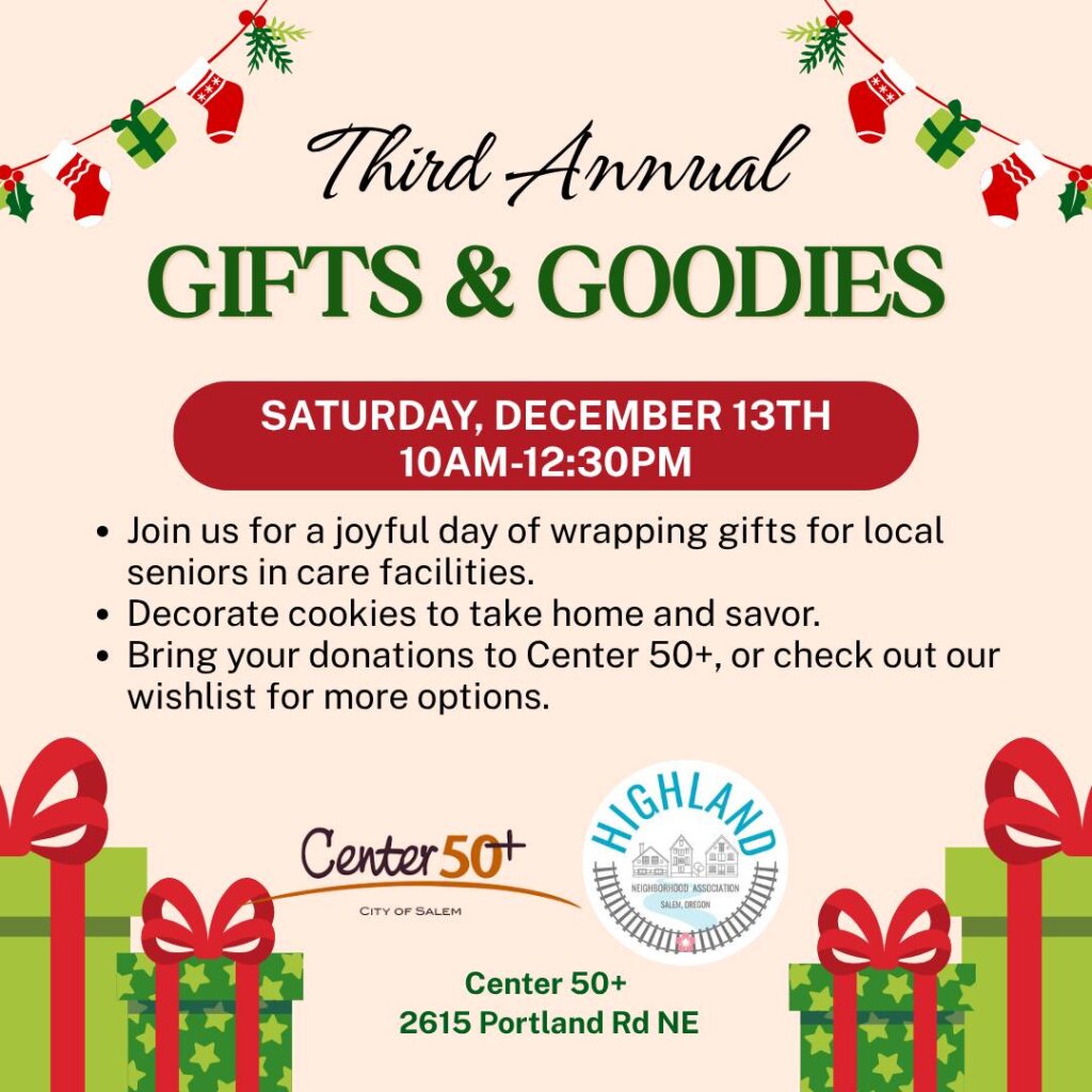 Join the Highland Neighborhood Association and Center 50+ for the 3rd Annual Gifts & Goodies event, a heartwarming holiday gift drive for seniors in care facilities. Stop by to help wrap donated gifts, decorate cookies, and spread cheer to elders who may not have family nearby.