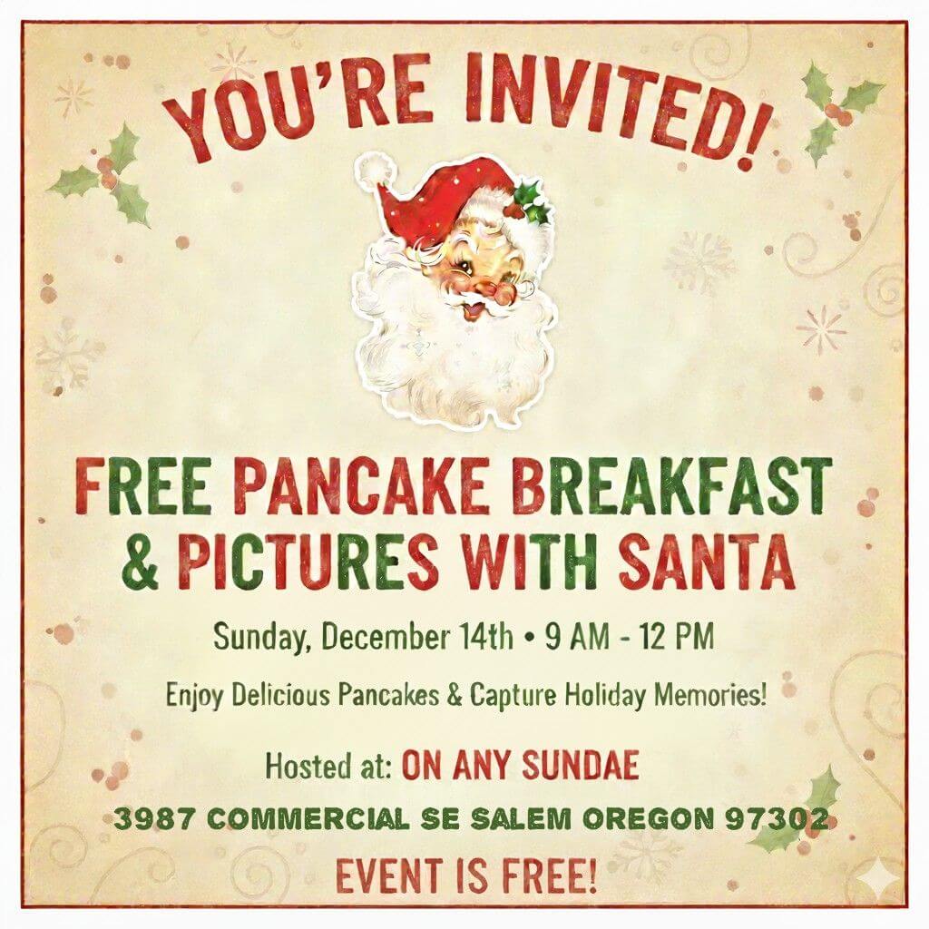 Santa’s busy in Salem! He’s making another stop at On Any Sundae, and you’re invited to eat breakfast with him! Enjoy a free pancake breakfast with juice or milk and a photo op with Santa. Bring along a non-perishable item to donate to the shop’s giving table and help spread even more holiday cheer.