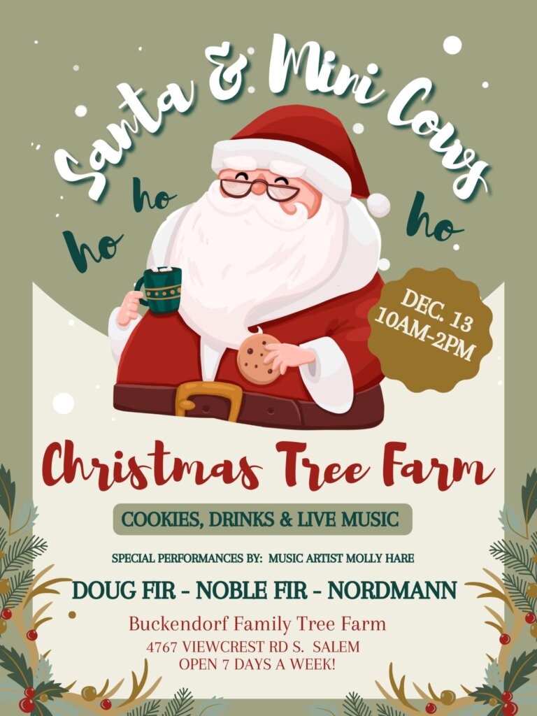 Still need a Christmas tree? Find one at Buckendorf Family Tree Farm, along with a unique farm experience featuring Santa and adorable micro mini cows! Browse a selection of Douglas fir, Noble fir, and Nordmann trees, enjoy warm drinks and treats, and catch a live musical performance by local artist Molly Hare.