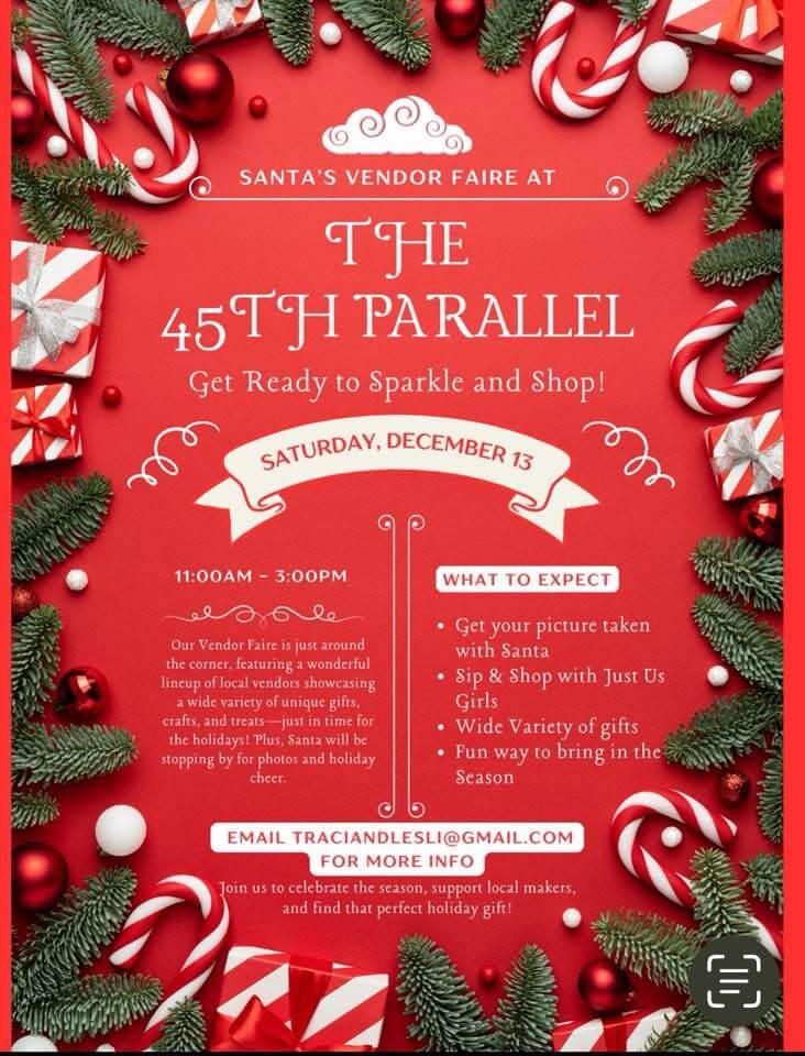 Santa’s Vendor Faire at 45th Parallel will provide a cheerful afternoon of local shopping, sipping, and seasonal fun. Enjoy finding handcrafted gifts and treats from local vendors, snap a photo with Santa, and sip your way through the event with Just Us Girls.