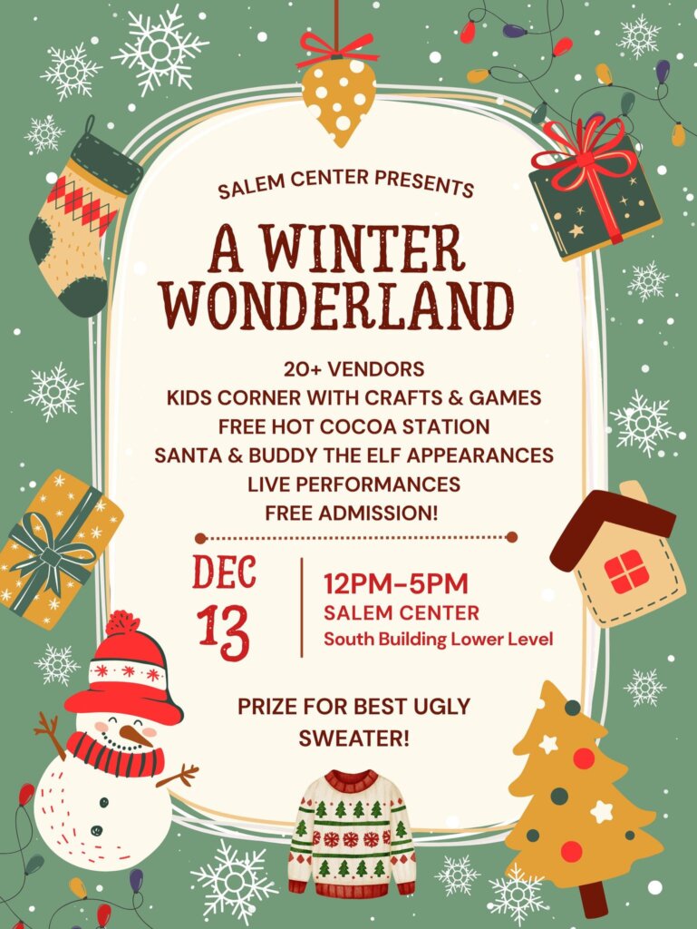 Step into a seasonal celebration at Salem Center’s Winter Wonderland! Hosted in the South Building (Lower Level), this event will feature over 20 local vendors, a free hot cocoa station, crafts and games in the Kids Corner, Santa visits all day, and a special appearance by Buddy the Elf from 3 PM – 5 PM. Enjoy live music, dancers, carolers, and more. Don’t forget to don your best ugly Christmas sweater for a chance to win the contest at 4 PM!