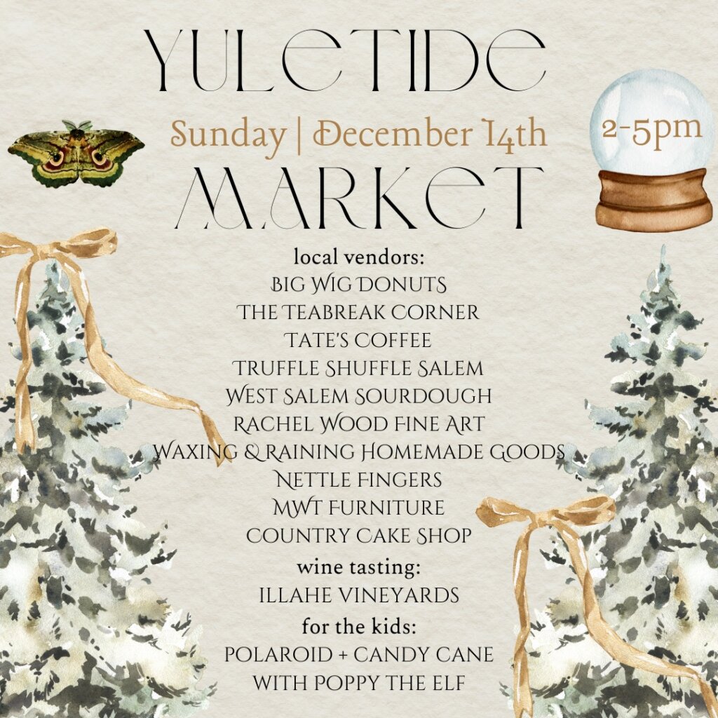 Fauning Over Flora is wrapping up the year with their second annual Yuletide Market. This cozy, family-friendly event includes a curated lineup of local vendors, wine tasting from Illahe Vineyards, sweet treats, Polaroids with Poppy the Elf, and plenty of holiday magic.