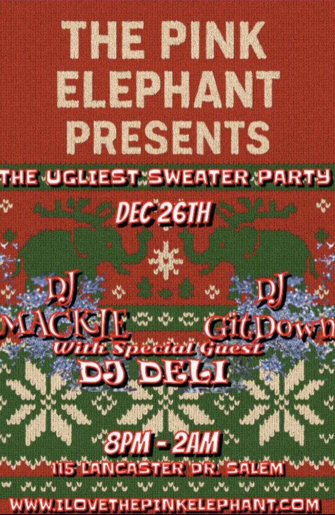 The Pink Elephant Tavern is keeping the holiday spirit alive with an energetic Ugly Sweater Party featuring DJs Mackie, Gitdown, and Deli. Come ready to dance and show off your most outrageous holiday sweater!