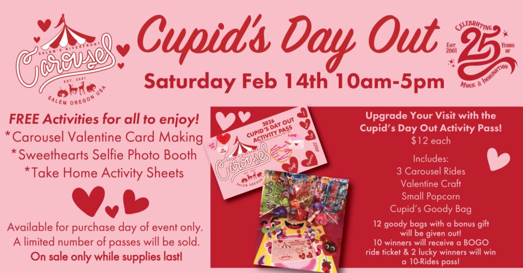 Celebrate Valentine’s Day with a little extra fun at Salem’s Riverfront Carousel during Cupid’s Day Out. Families are invited to enjoy free activities throughout the day, including a sweetheart photo booth, Valentine card making, and take-home activity sheets.