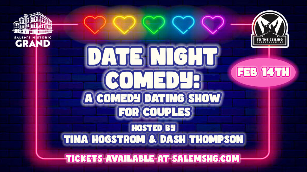 Make Valentine’s Day unforgettable at Salem’s Historic Grand Theatre with Date Night, a fast-paced comedy experience designed for couples. Hosted by the quick-witted duo Tina Hogstrom and Dash Thompson, the show blends improv, stand-up, and interactive games that bring the audience into the action.