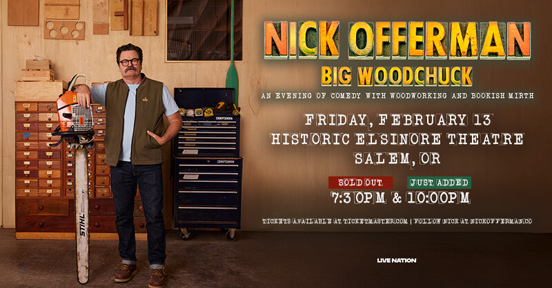 Comedian, actor, and master woodworker Nick Offerman brings his Big Woodchuck tour to the Elsinore Theatre for a late-night performance packed with sharp wit, songs, and handcrafted humor. Inspired by his newest book, Little Woodchucks, Offerman (joined by woodworker and co-author Lee Buchanan) shares stories, musings, and encouragement to create something with your own two hands.