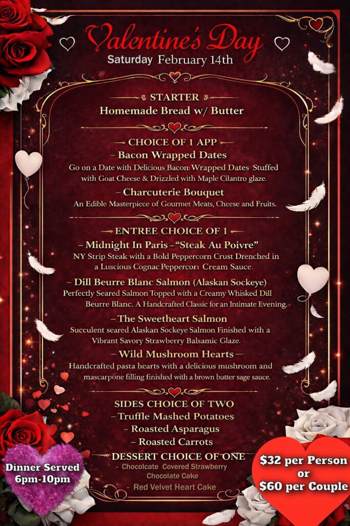 Enjoy a specially curated Valentine’s Day dinner at The Pink Elephant. Guests can savor a thoughtfully prepared meal served from 6:00 PM to 10:00 PM and live Blues Rock music beginning at 8:00 PM. Reservations are available but not required.