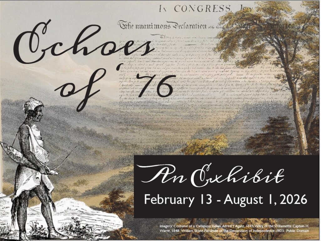 The Willamette Heritage Center invites the community to explore Echoes of ’76, a multi-part exhibit commemorating the 250th anniversary of the Declaration of Independence. While the events of 1776 didn’t take place in the Mid-Willamette Valley, this exhibition reflects on how the ideas of that pivotal year have echoed throughout local history.