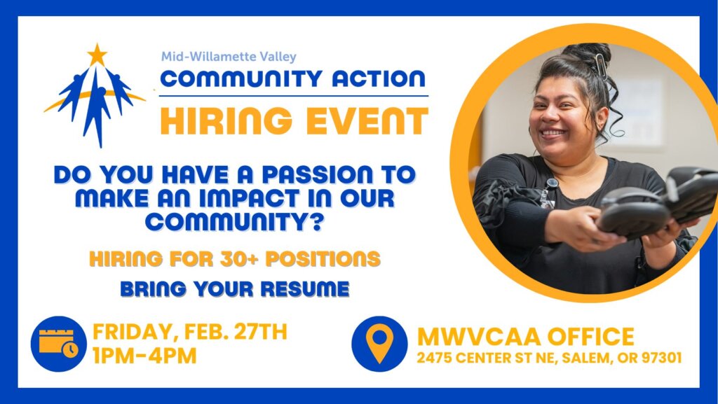Those looking to make a meaningful impact in the Salem community are invited to attend the Hiring Event hosted by Mid-Willamette Valley Community Action Agency. With more than 30 career opportunities available (including Preschool Teachers, Case Managers, Finance and IT roles, and more) this event is a great chance to explore a career that serves local youth, veterans, and individuals experiencing homelessness.