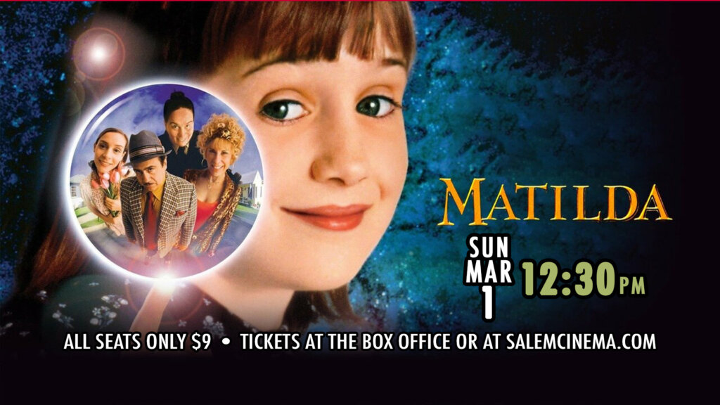 Celebrate 30 years of Matilda with a special anniversary screening at Salem Cinema. This family classic follows the brilliant and brave Matilda Wormwood as she discovers her telekinetic powers and learns to stand up to the challenges in her life with the help of a kind teacher and loyal friends.