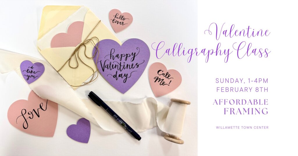 Affordable Framing is hosting a beginner-friendly calligraphy workshop focused on creating beautifully hand-lettered Valentine cards and envelopes. The $25 registration includes your own calligraphy pen to keep, all materials (cards, envelopes, wax seals), plus snacks and beverages. Come learn a new skill in a creative environment!