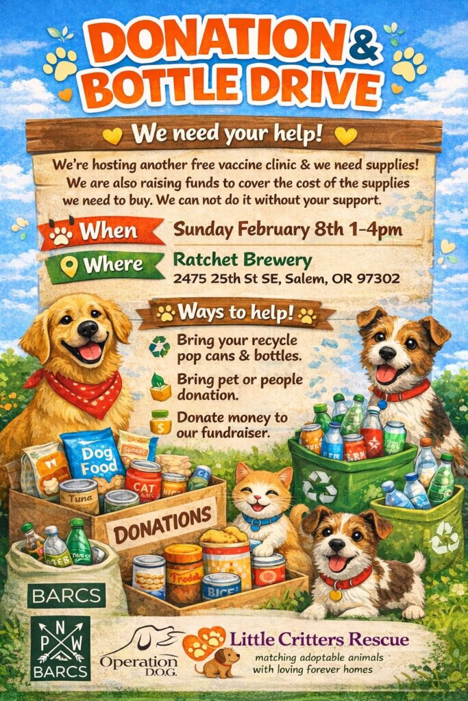 Join Little Critters Rescue and PNW BARCS at Ratchet Brewery for a community bottle and donation drive supporting their upcoming vaccine clinic. Bring your refundable bottles and cans, as well as pet (and people) supplies, to help make a difference for animals and neighbors in need.