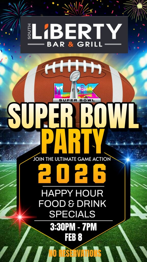 Catch the big game at South Liberty Bar on their giant projection screen or any of their 11 TVs. Enjoy Happy Hour food specials and half-off domestic drafts and well drinks from 3:30 PM to 7:00 PM!