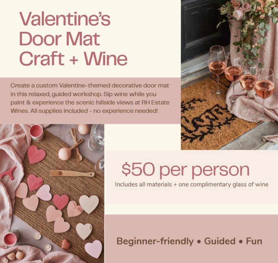 Spend a cozy afternoon at RH Estate Wines crafting your own Valentine-themed door mat while enjoying a glass of wine and hillside views. This beginner-friendly workshop is led by local crafters Michelle Jones Nash and Jenn Nelson, and includes all materials, guided instruction, and one complimentary glass of wine. Space is limited, so register ahead of time.