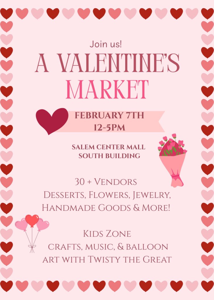 Salem Center is hosting a Valentine’s Market featuring over 30 local vendors offering sweet treats, flowers, jewelry, handmade gifts, clothing, and more! Located on the lower level of the South Building (near Victoria’s Secret), the event also includes a Kids Zone with crafts, music, and balloon art by Twisty the Great.